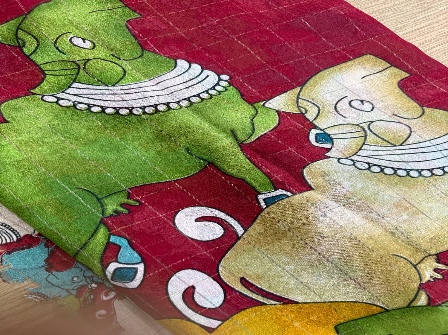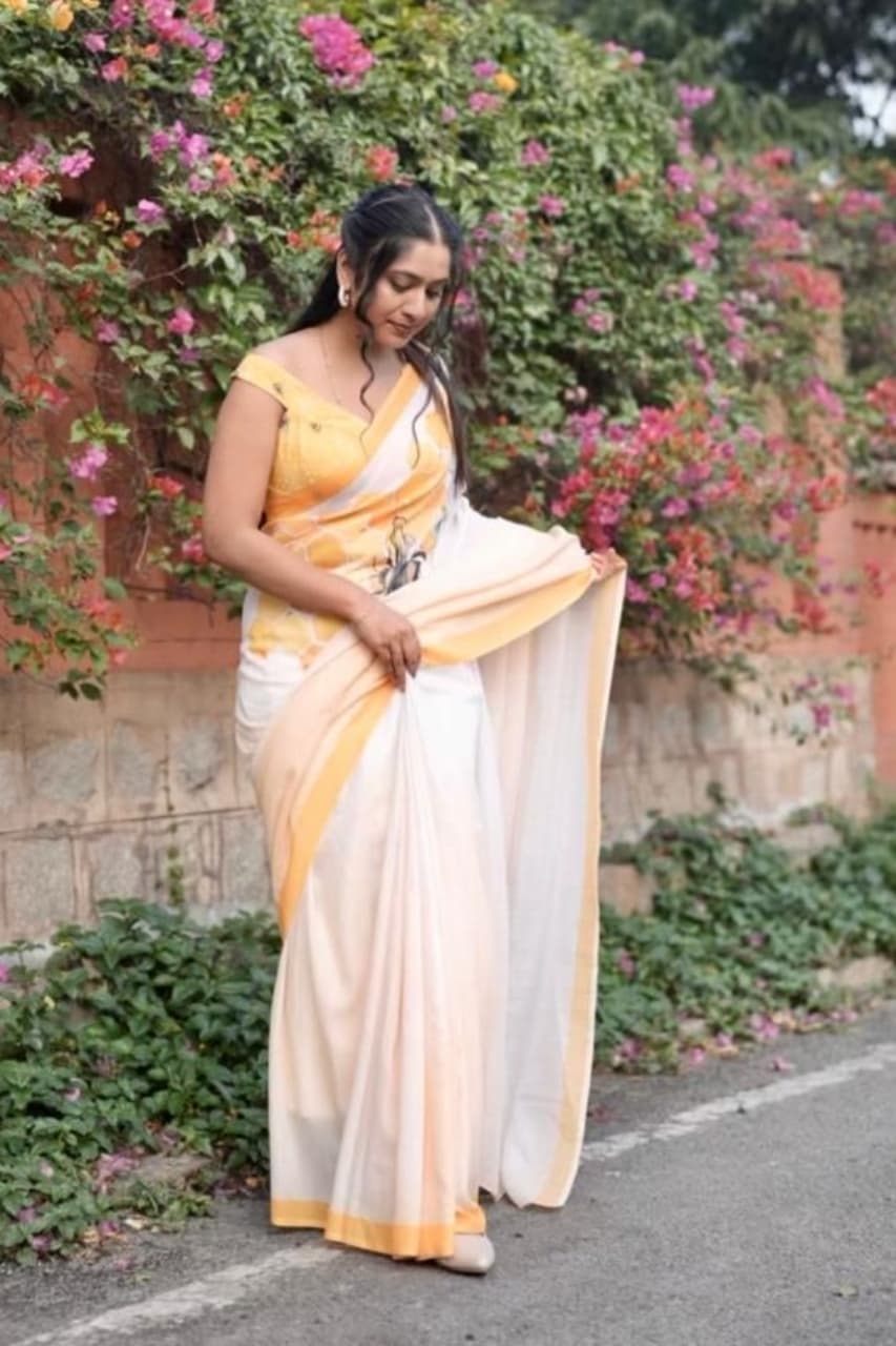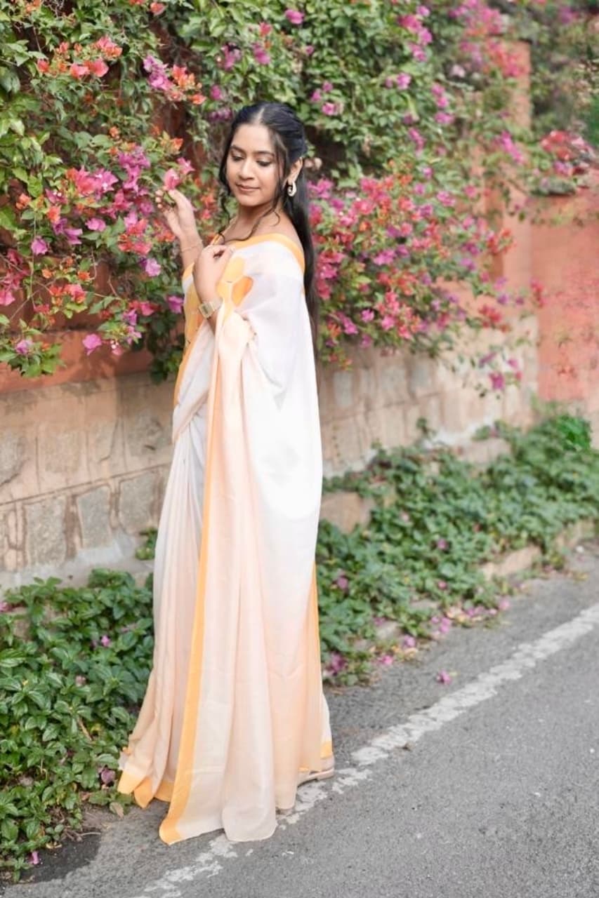 Fabric - space silk Super soft, glides on body 5.5 mtrs Styling tip - Pair it with our natural crepe blouse piece . Washcare -handwash, first wash with rock salt diluted water .