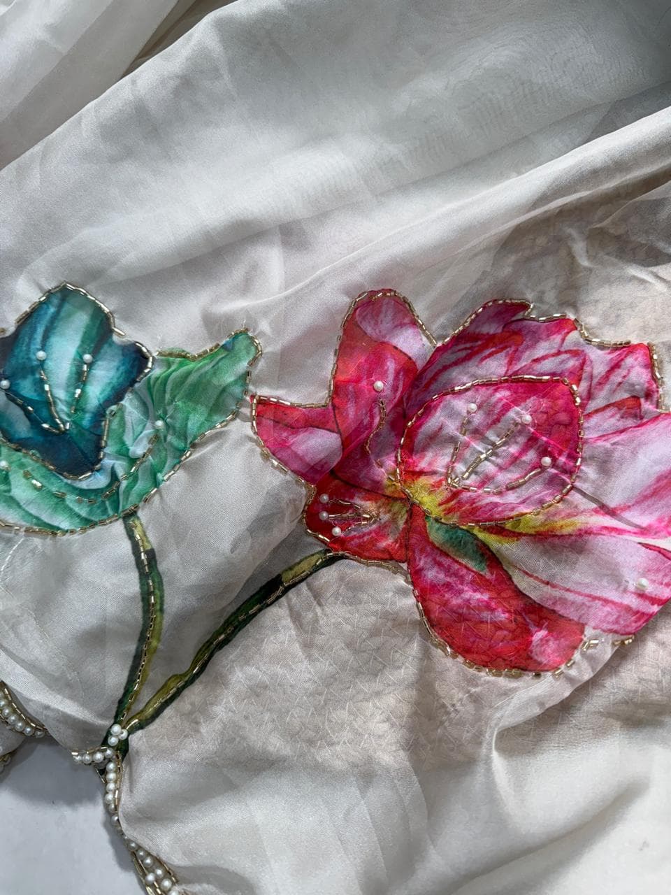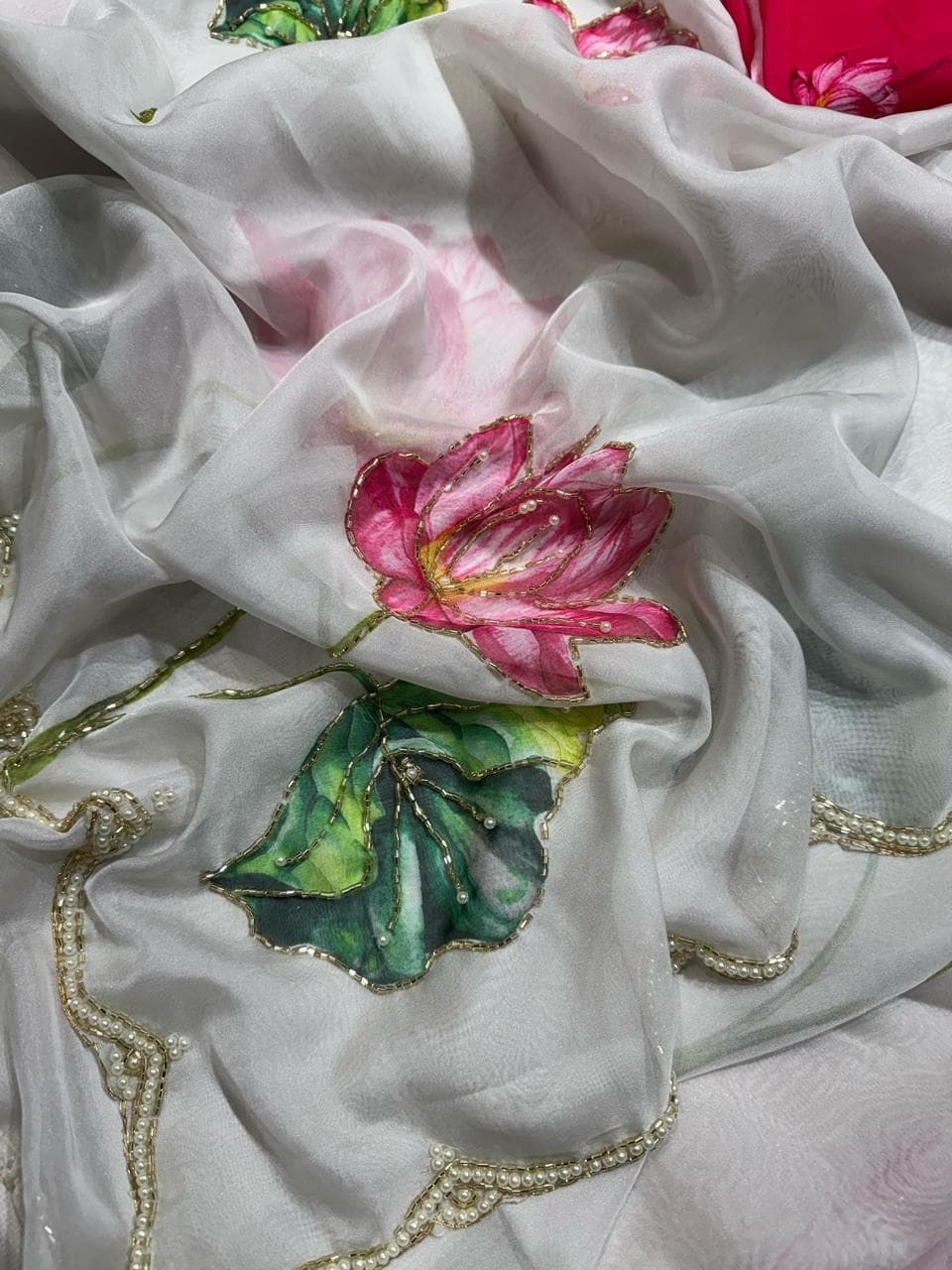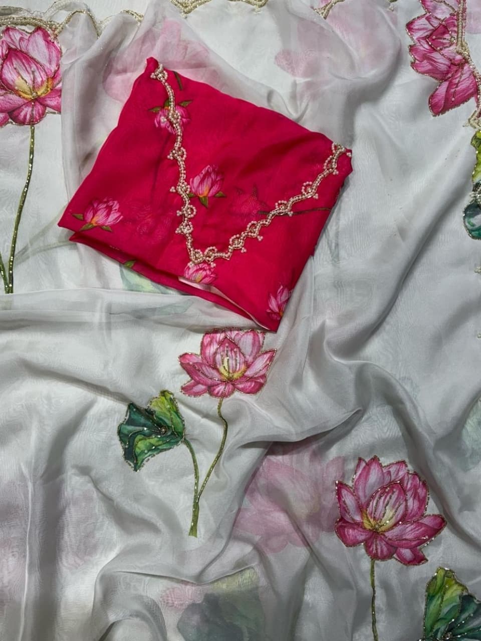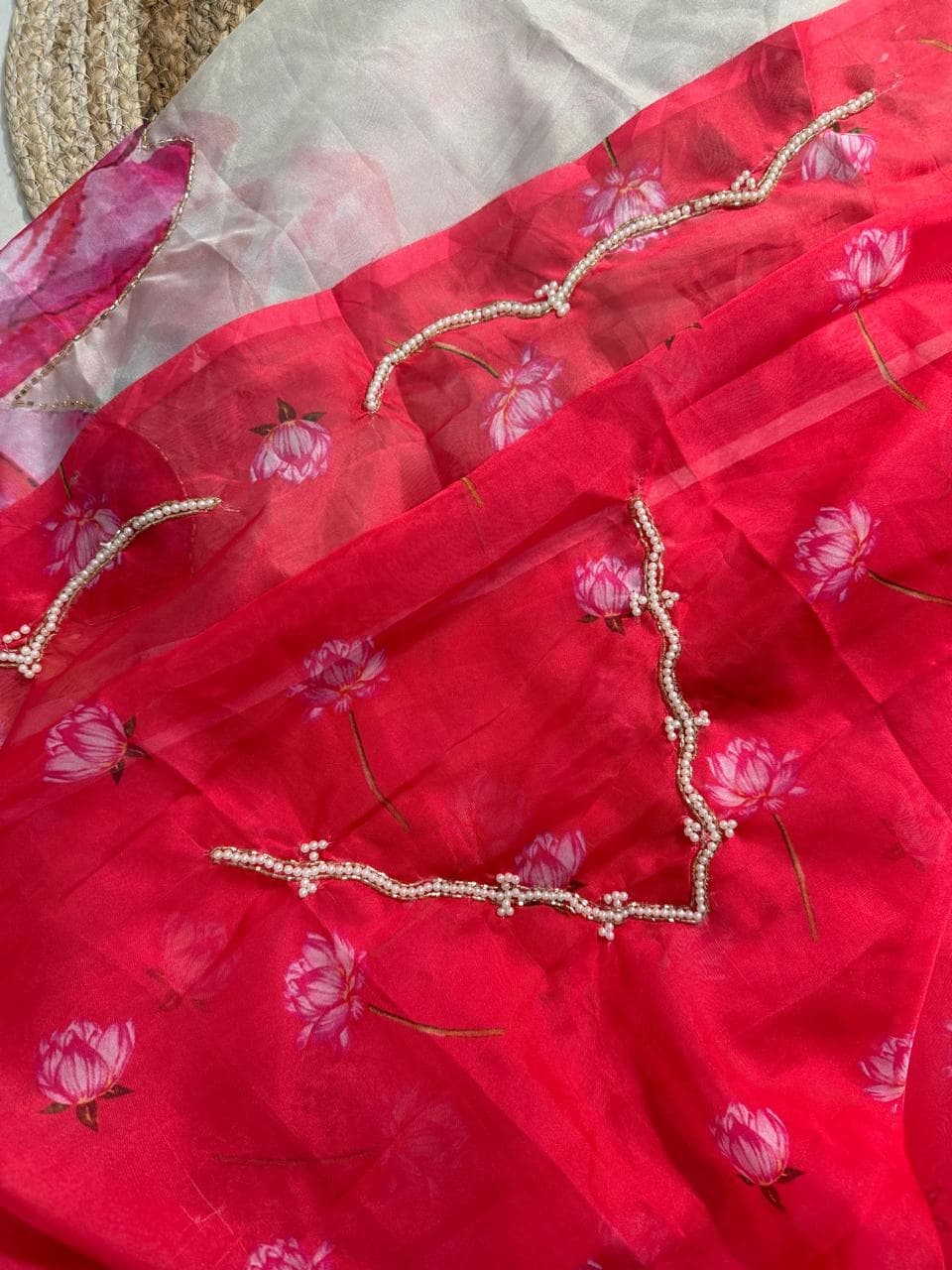 Fabric - Soft organza Color - Cream base Lotus print Border - scallop pearls and beads Blouse - printed organza with embroidery on sleeves and neck