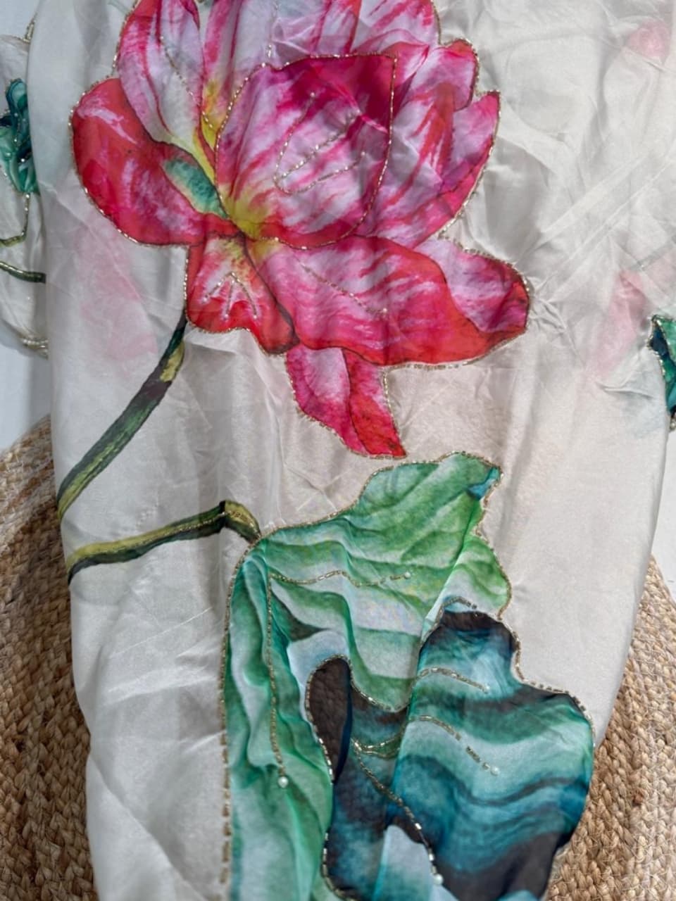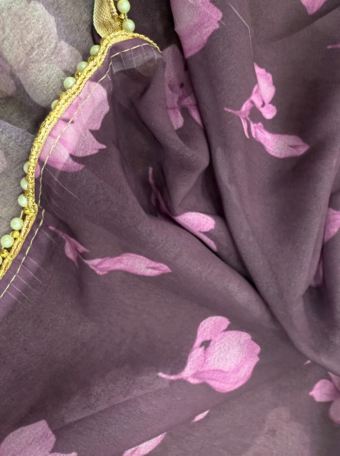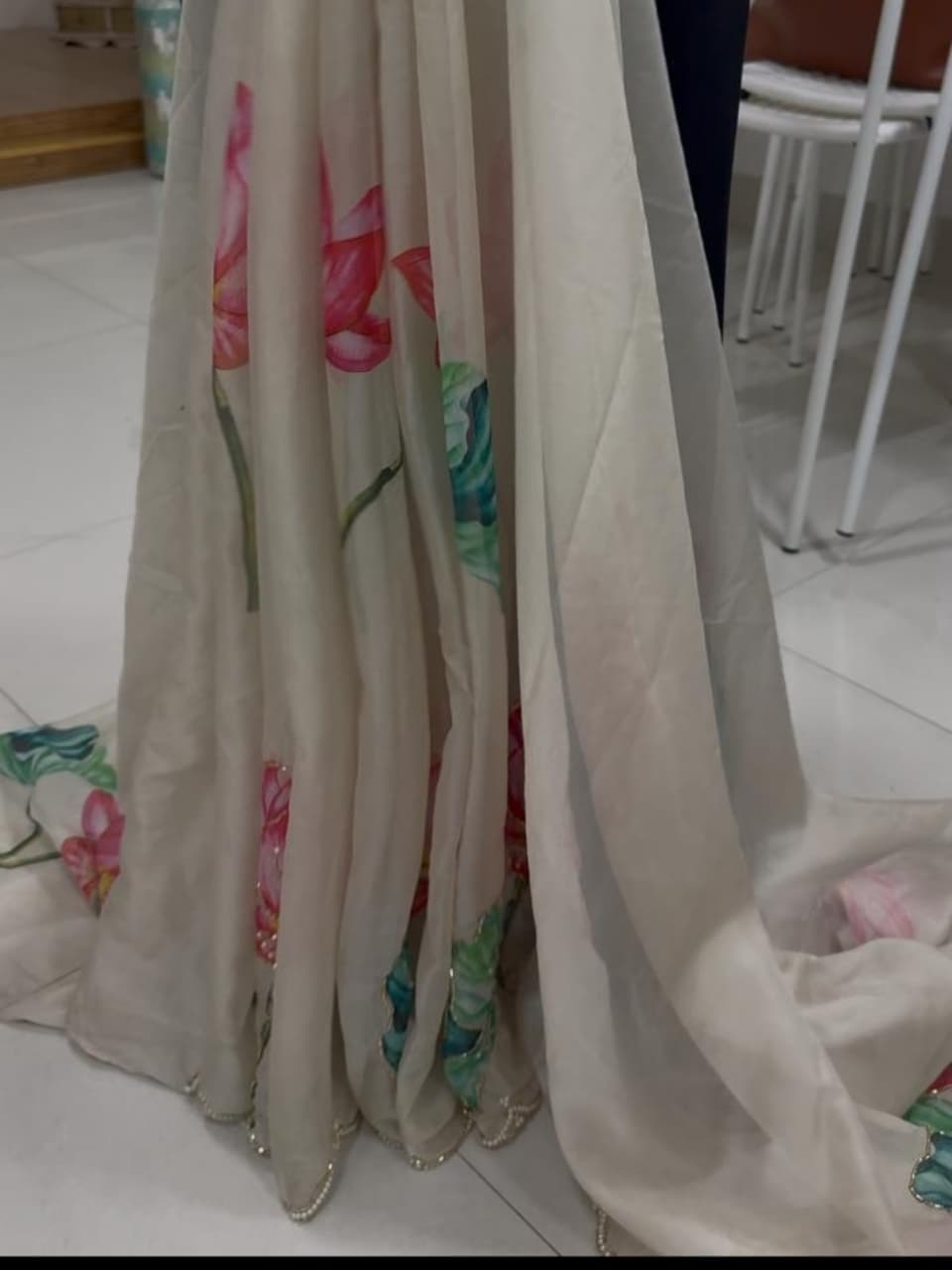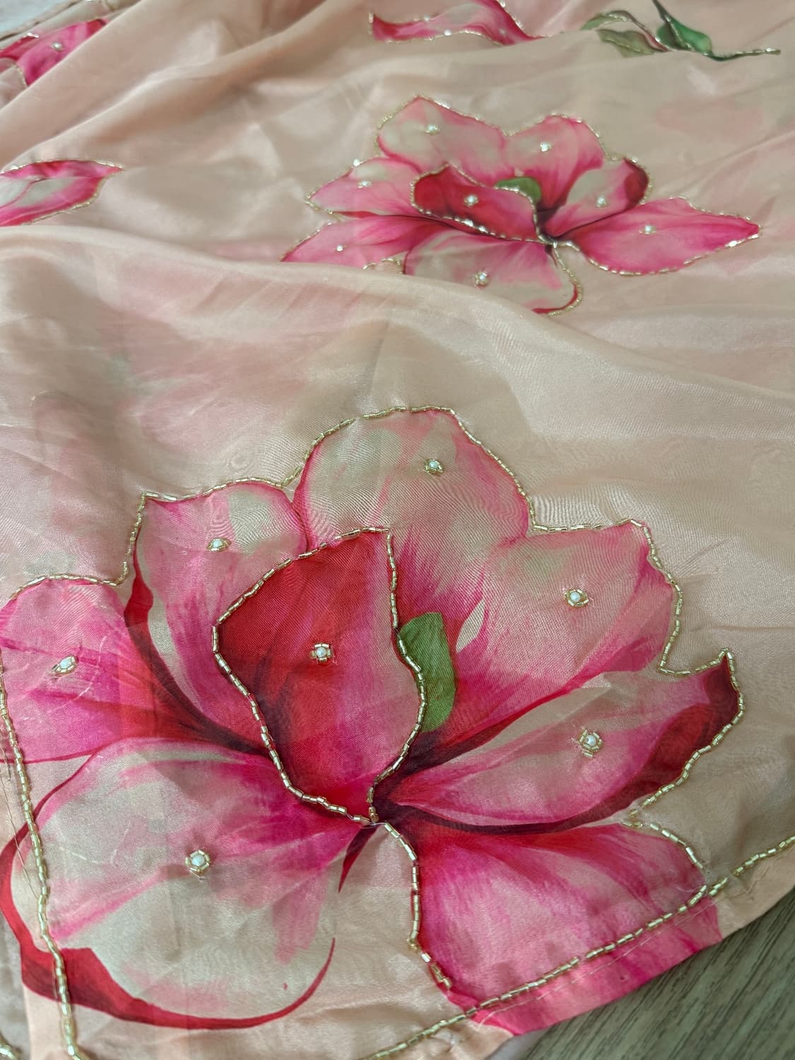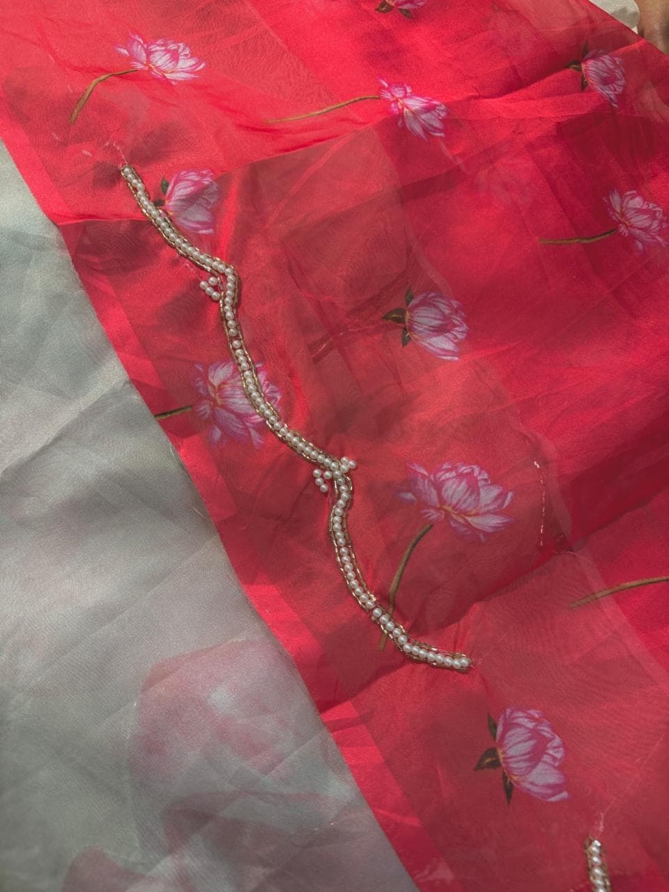 Fabric - Soft organza Color - Cream base Lotus print Border - scallop pearls and beads Blouse - printed organza with embroidery on sleeves and neck