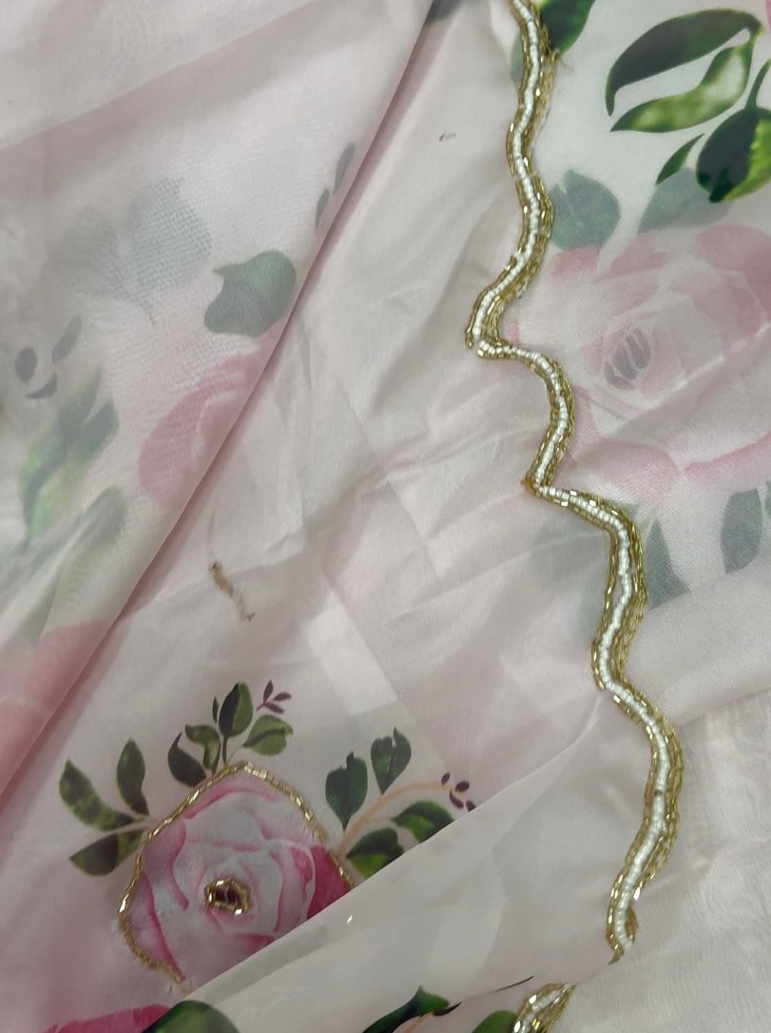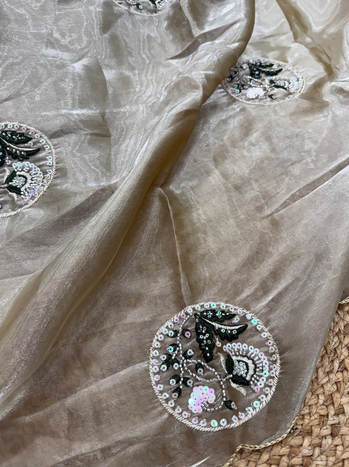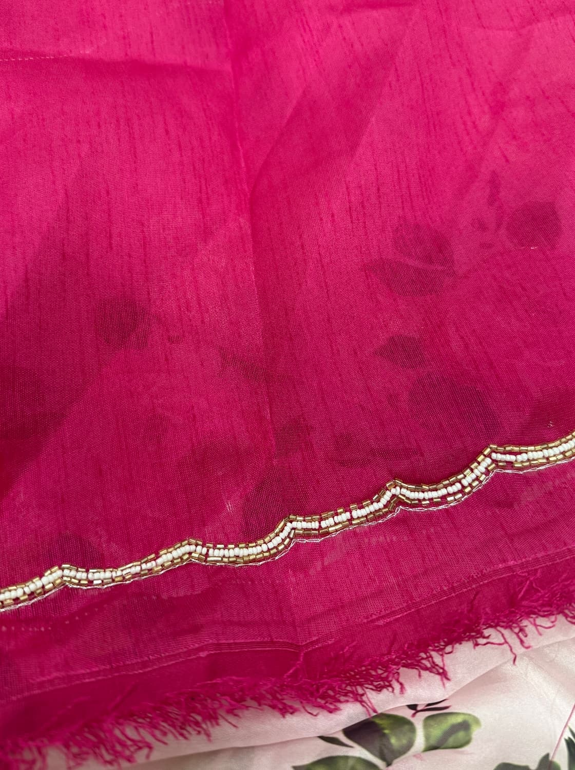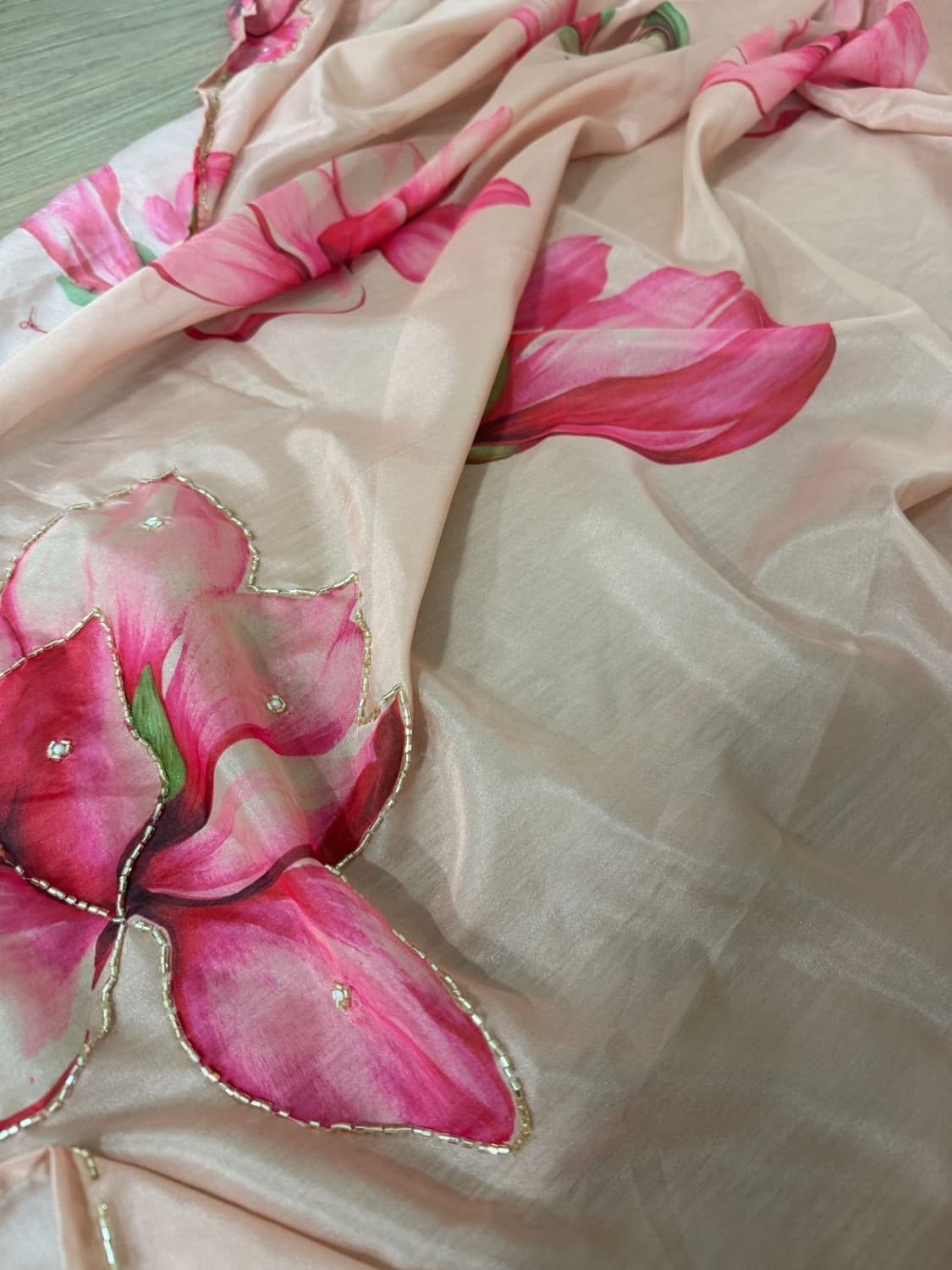 Fabric - Soft organza Color - Cream base Lotus print Border - scallop pearls and beads Blouse - printed organza with embroidery on sleeves and neck