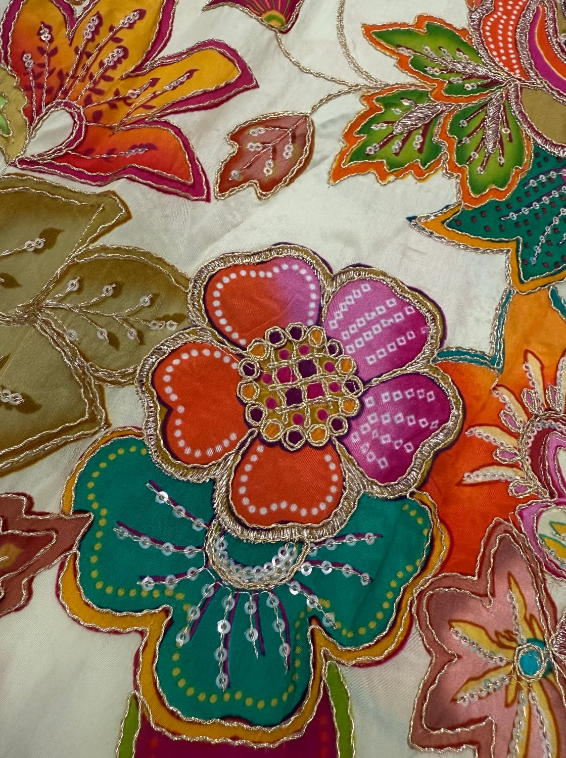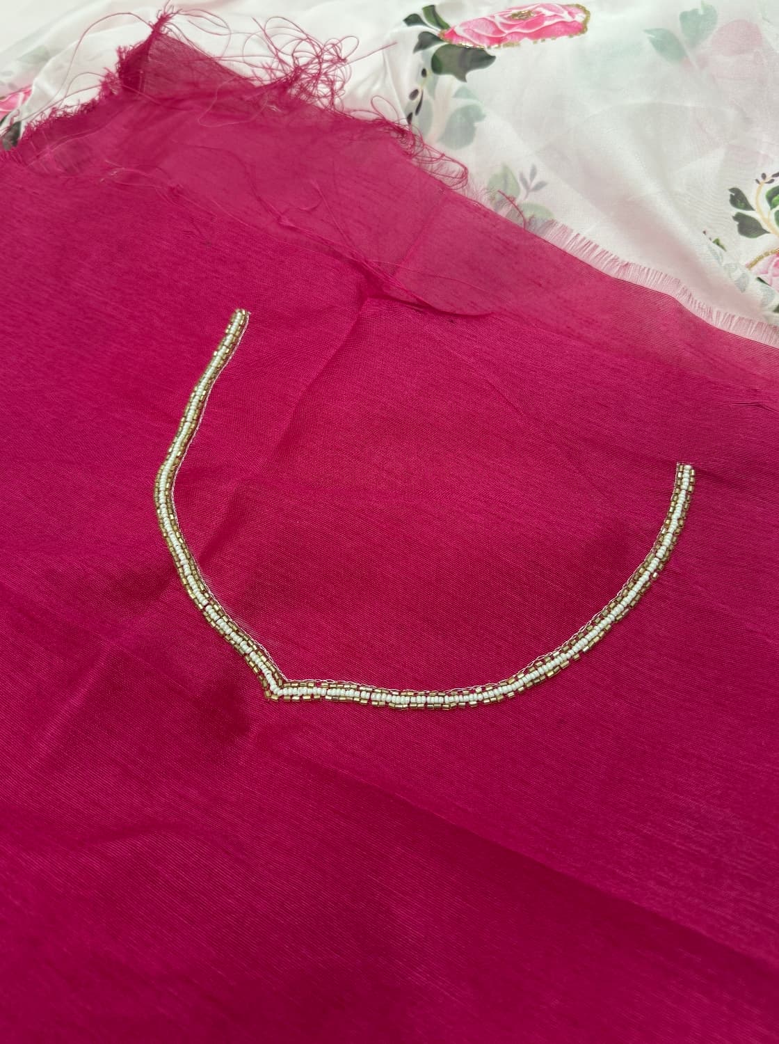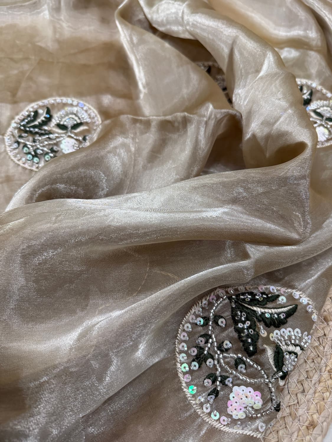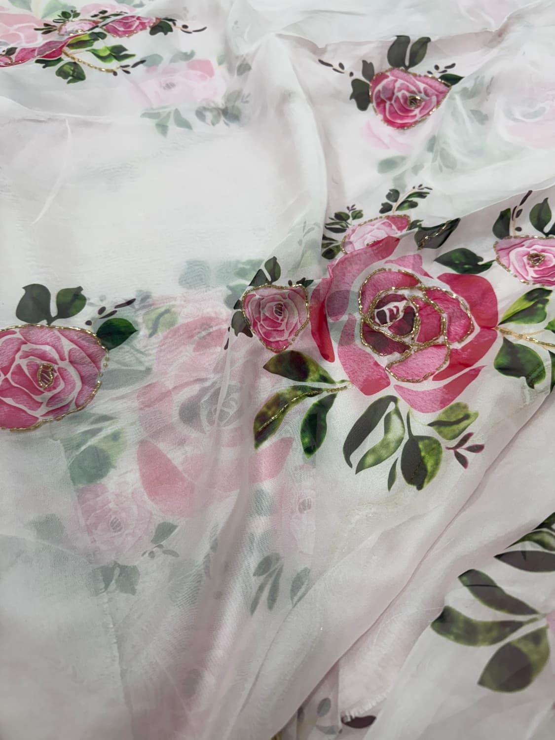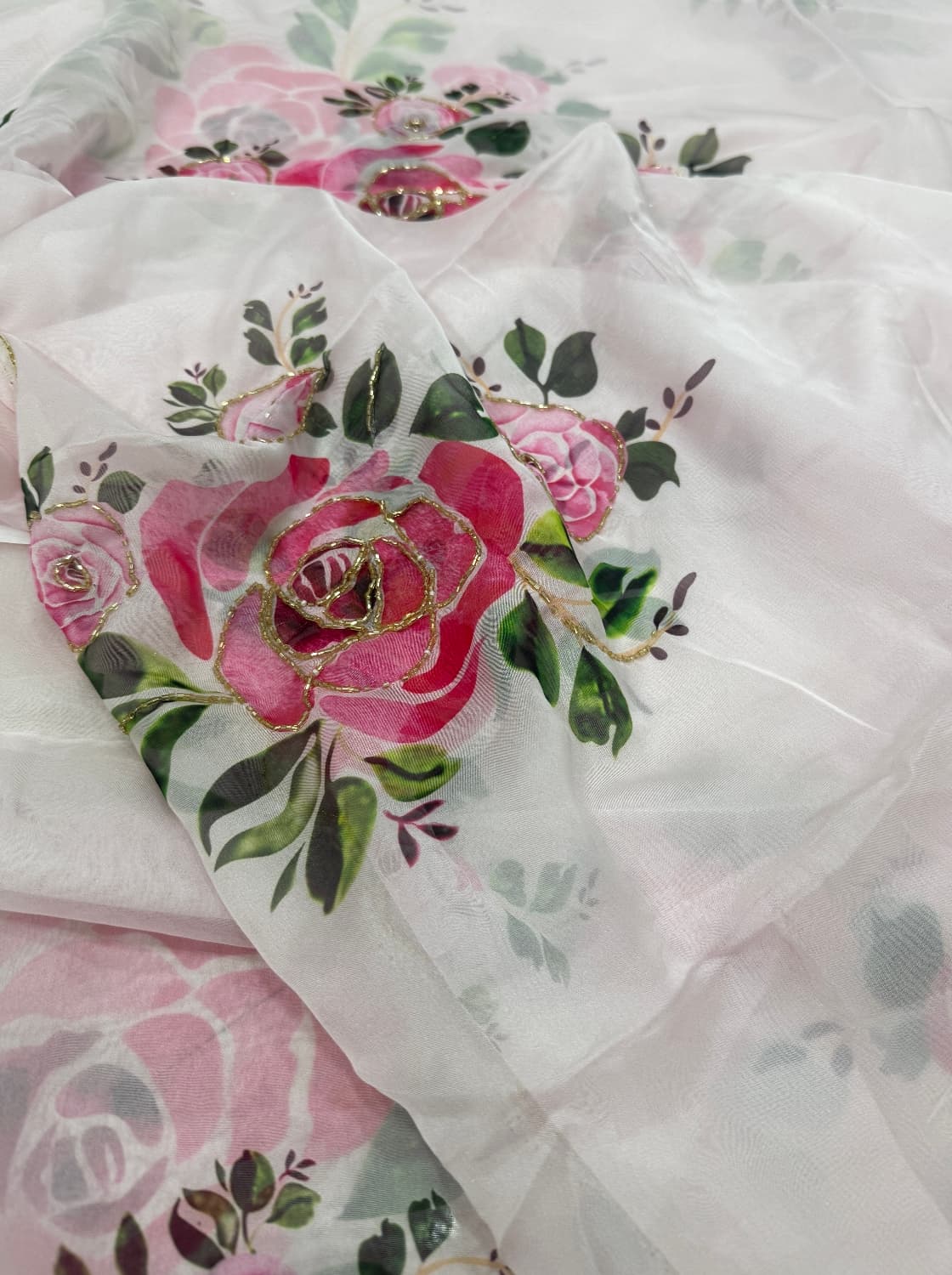 Fabric - Soft organza Color - Cream base Lotus print Border - scallop pearls and beads Blouse - printed organza with embroidery on sleeves and neck