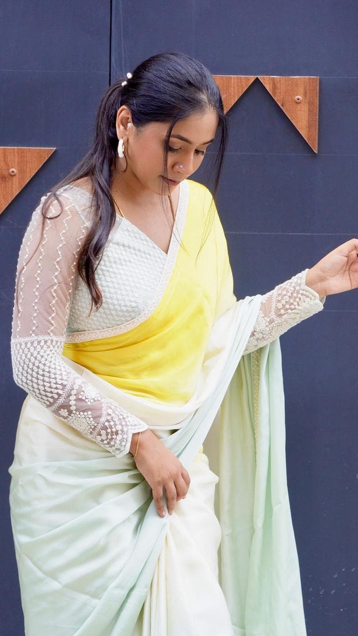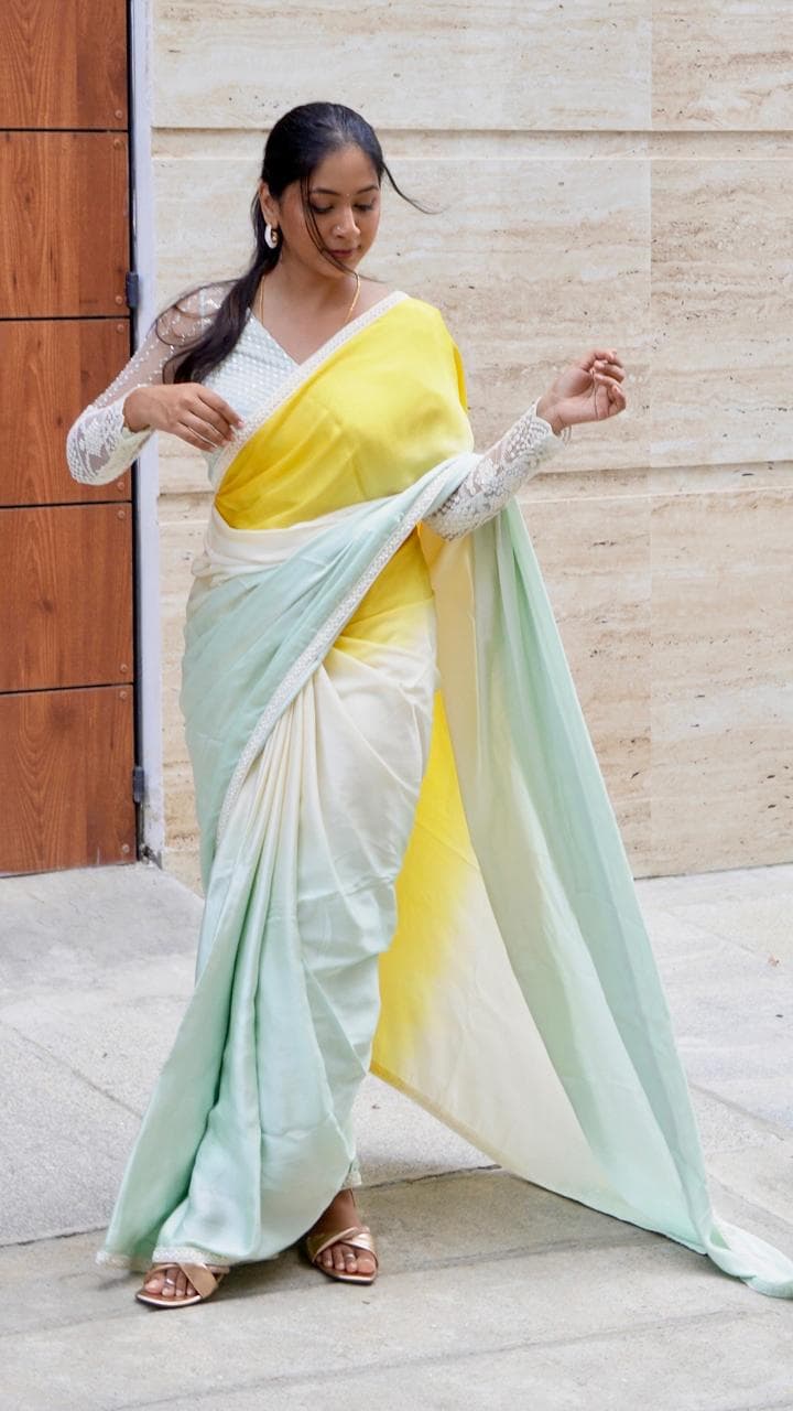 Color : Ombre , sky blue- cream - yellow Fabric : modal satin (5.5mtrs) Blouse : 80cms to 1 mtr Running blouse Border : pearl work cotton designer border Super soft saree, easy to drape 2 piece available