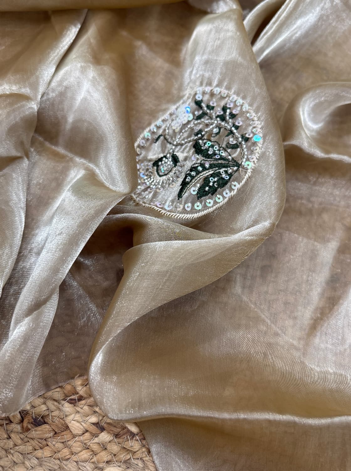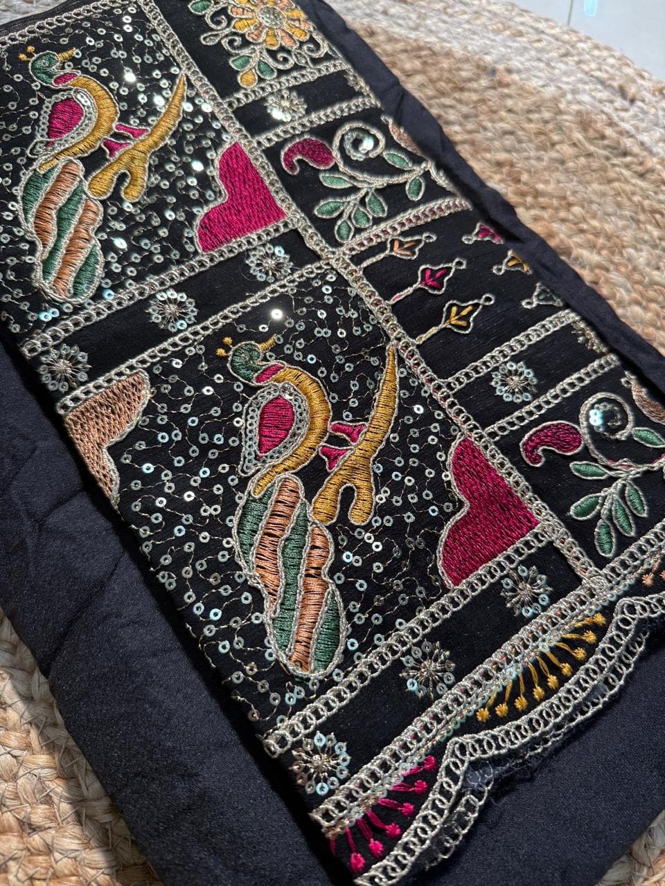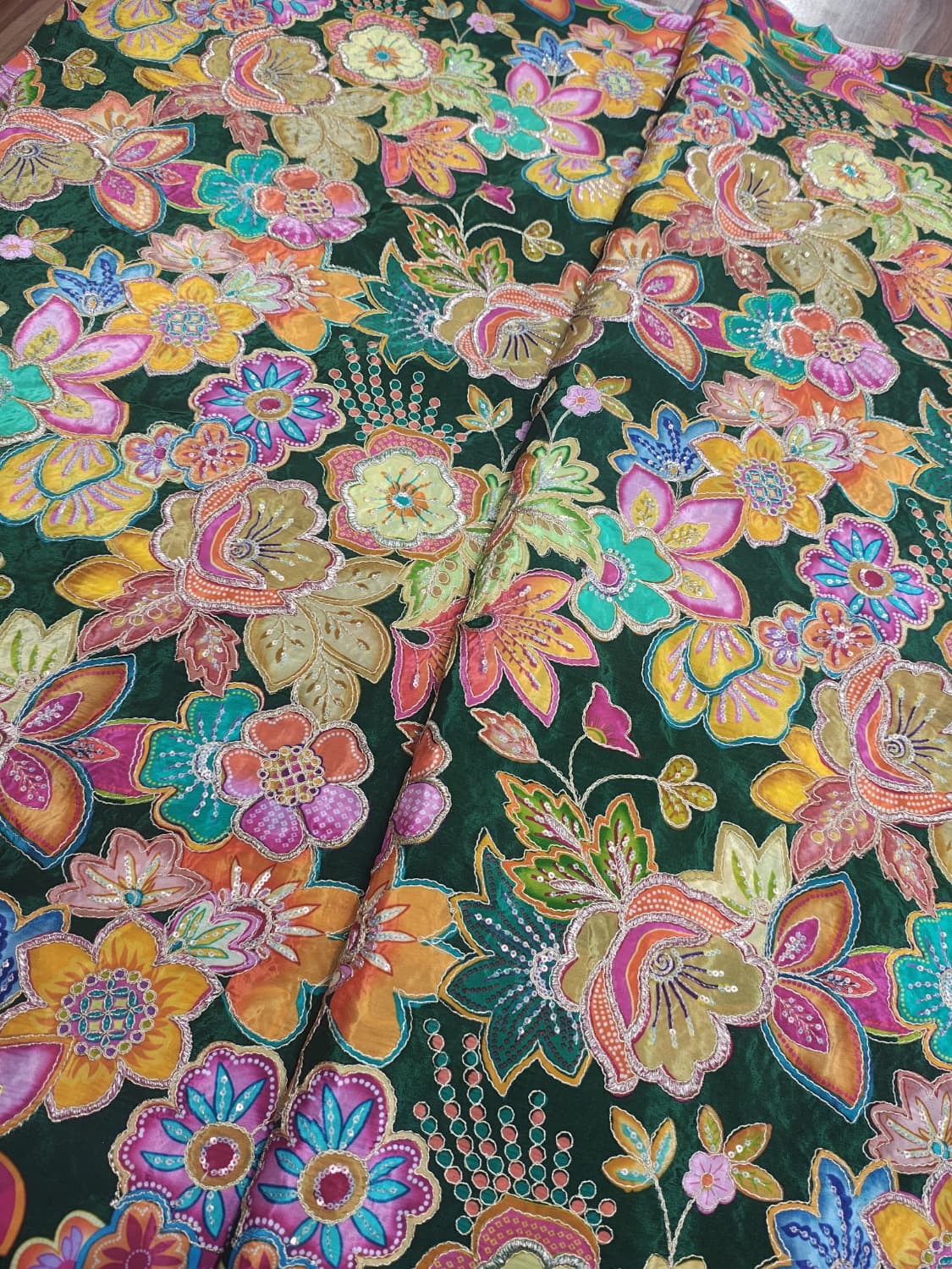 Fabric - Natural crepe (looks just silk) Comes with embroidery and sequin work . Extremely body friendly . 1 metre Free shipping 40 pannah , suitable for saree, lehenga ,blouse , indo western fits If required more than 1 mtr , whatsapp on 8951432832 PREBOOKINGS WILL OPEN SOON