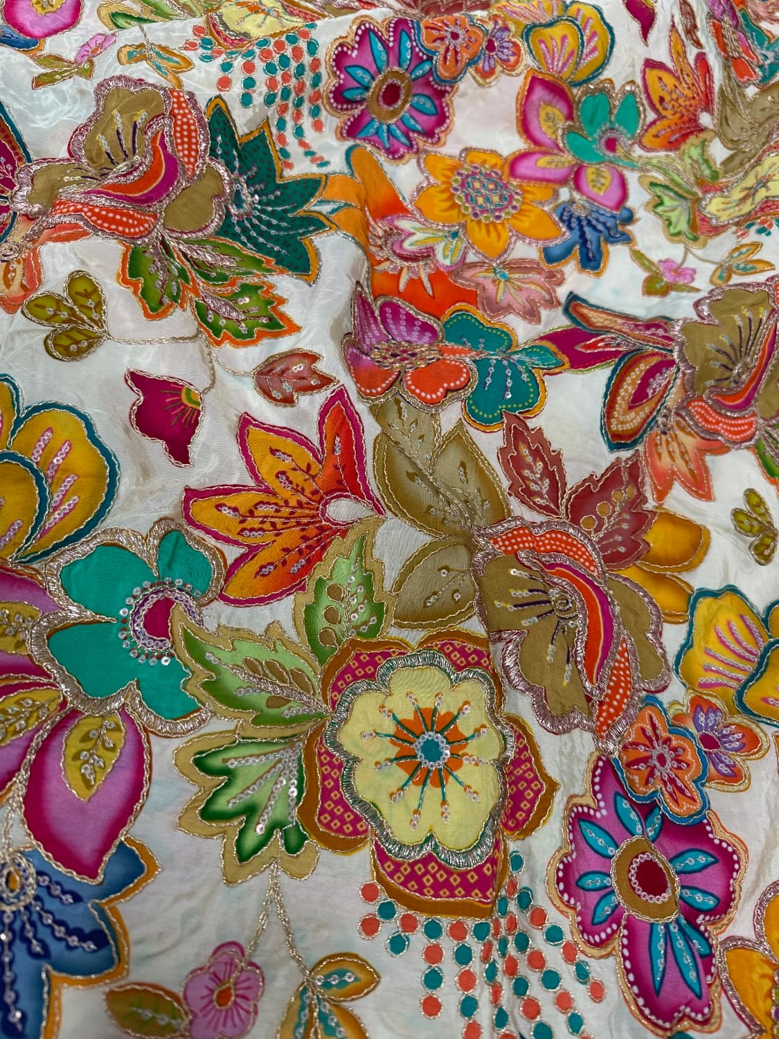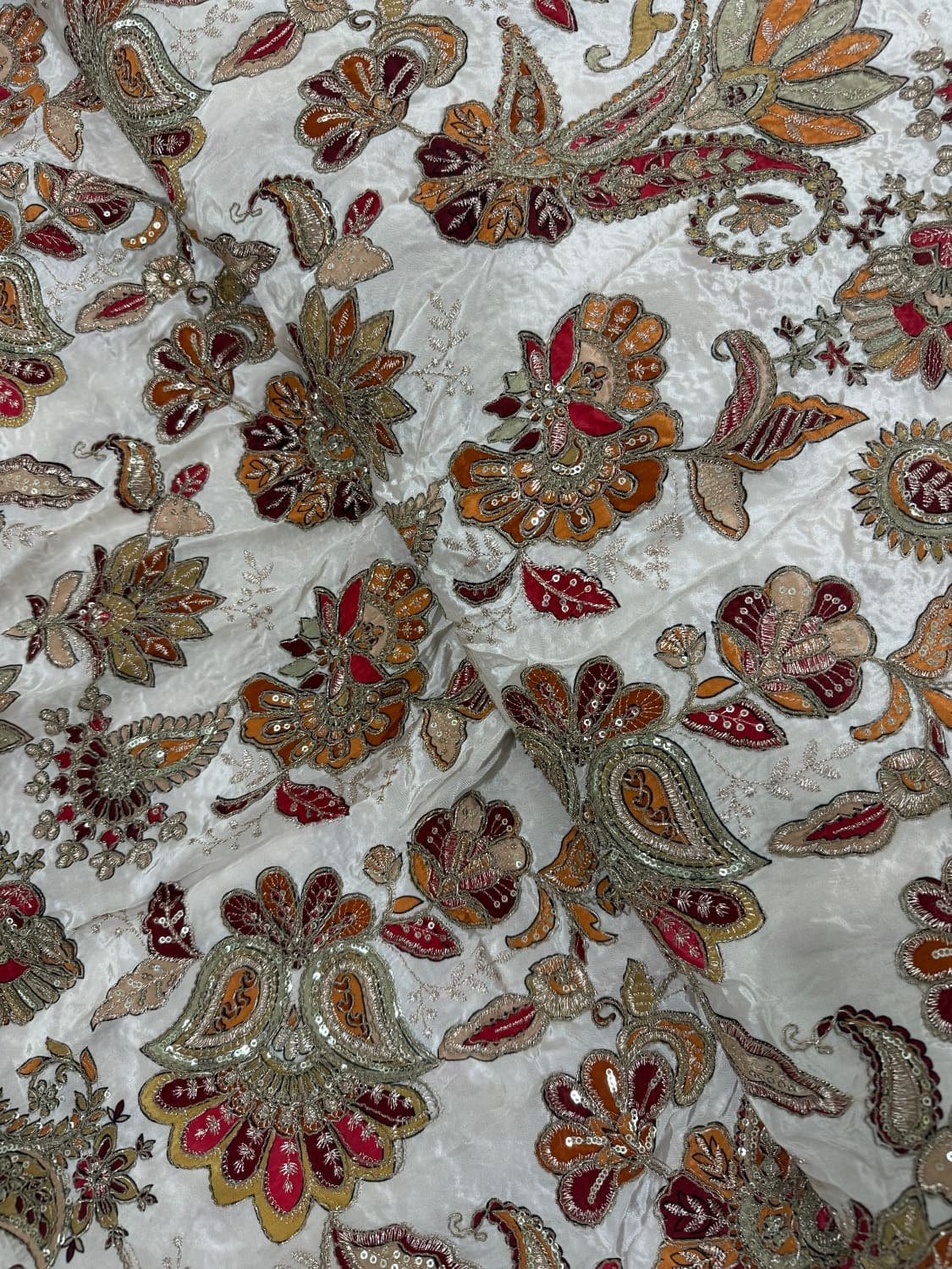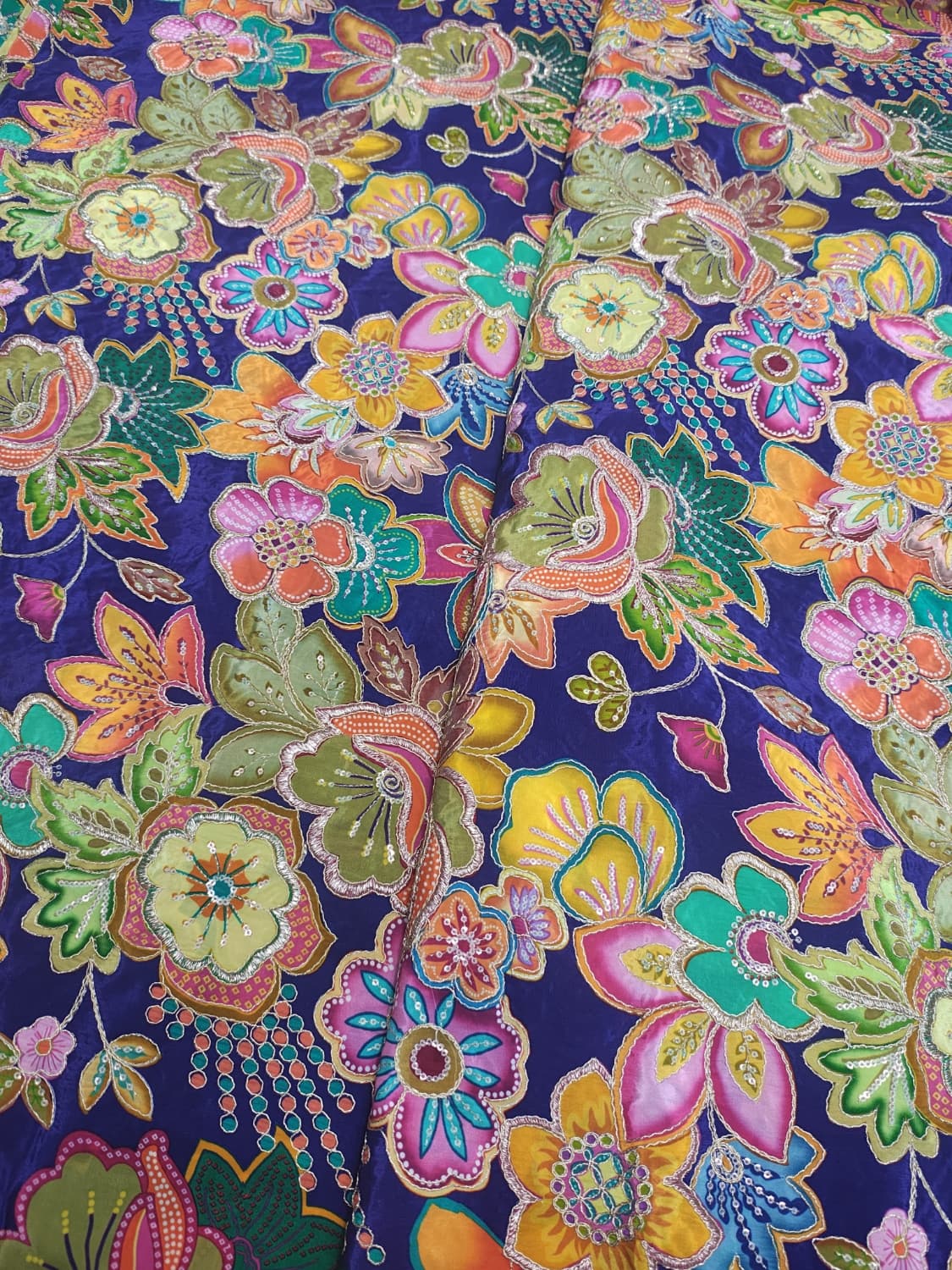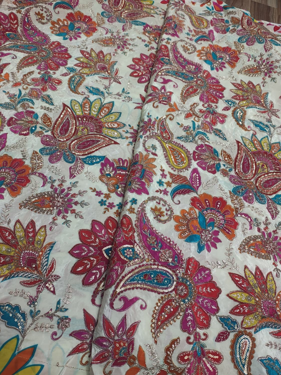 Fabric - Natural crepe (looks just silk) Comes with embroidery and sequin work . Extremely body friendly . 1 metre Free shipping 40 pannah , suitable for saree, lehenga ,blouse , indo western fits If required more than 1 mtr , whatsapp on 8951432832 Sold