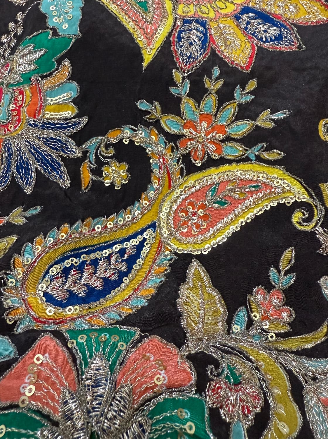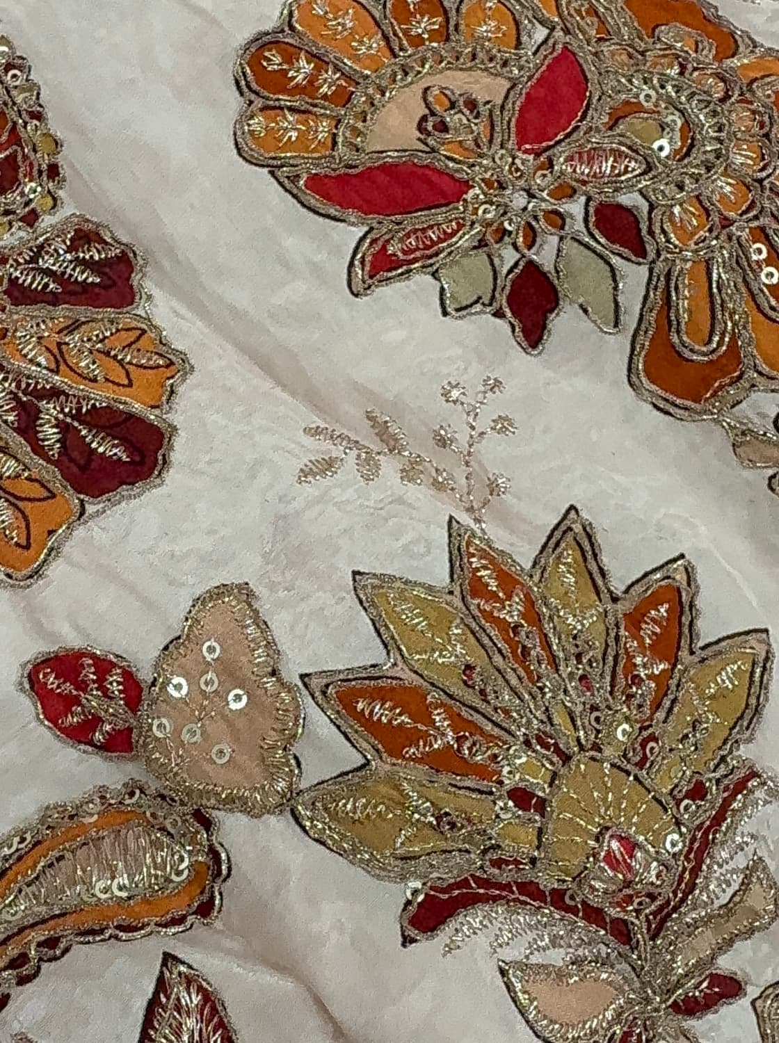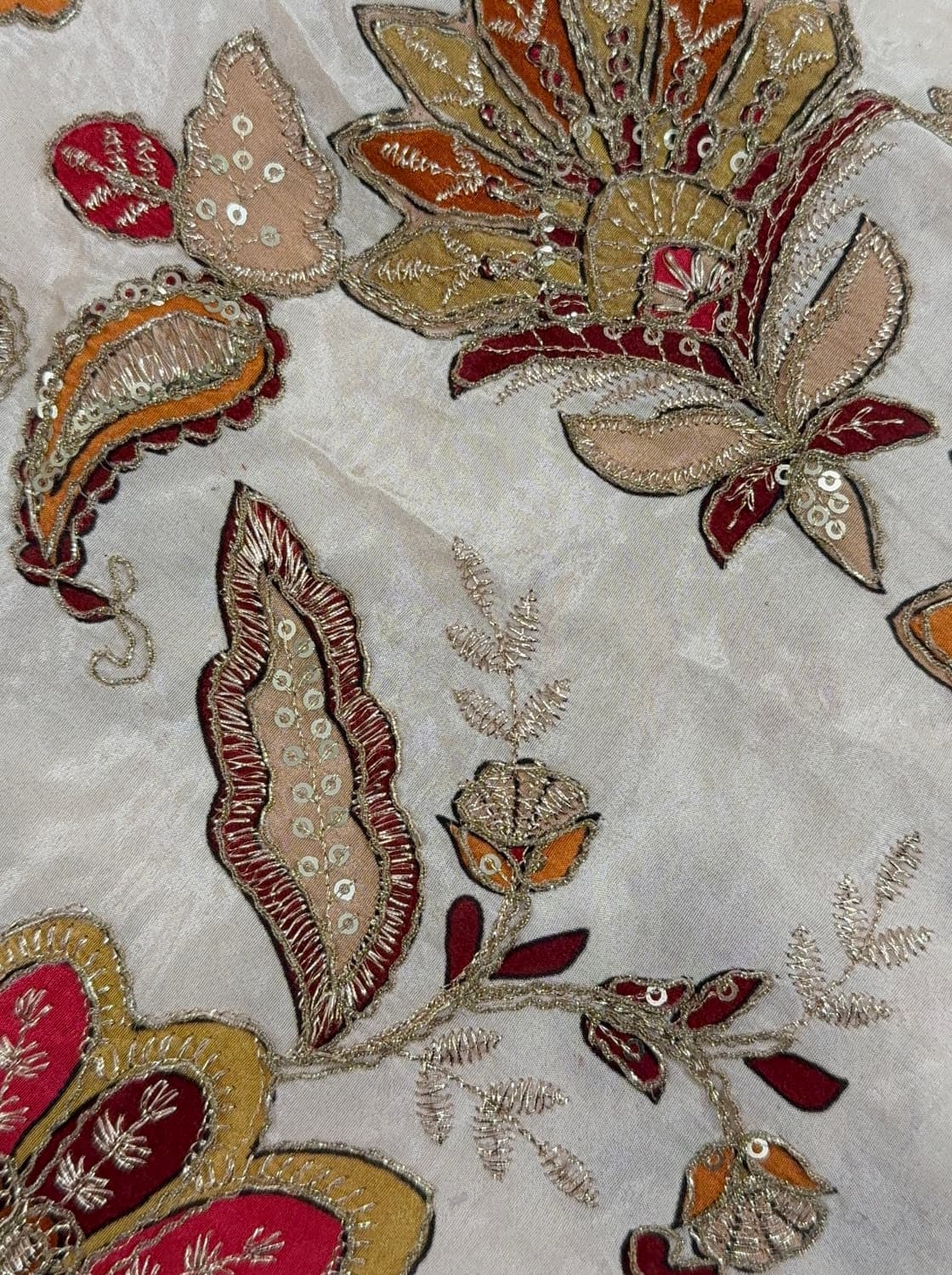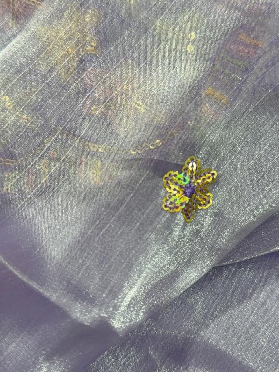 Fabric - Natural crepe (looks just silk) Comes with embroidery and sequin work . Extremely body friendly . 1 metre Free shipping 40 pannah , suitable for saree, lehenga ,blouse , indo western fits If required more than 1 mtr , whatsapp on 8951432832 Sold