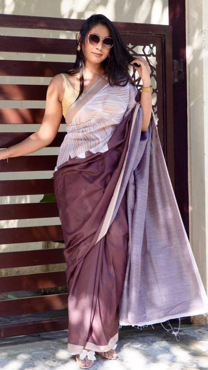 Saree color - Chocolate brown Fabric - mul cotton Blouse piece - 80cms cream color Slightly darker than picture SOLD OUT