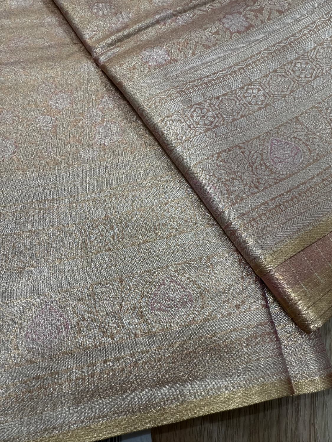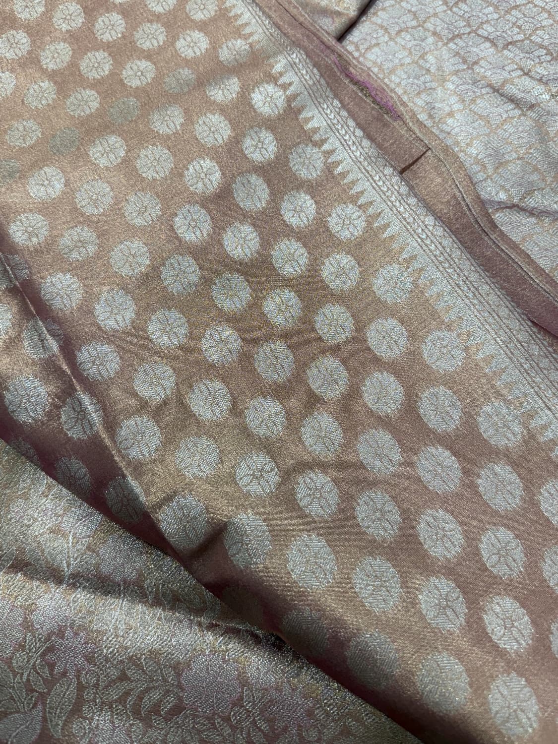 Fabric - Super soft tissue (complete saree zari) Color - Peach Border - zari Blouse - butta Pleates will flow the way you tell 1 in stock Dispatch 7 -14 working days