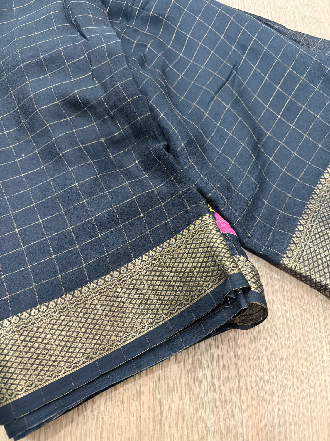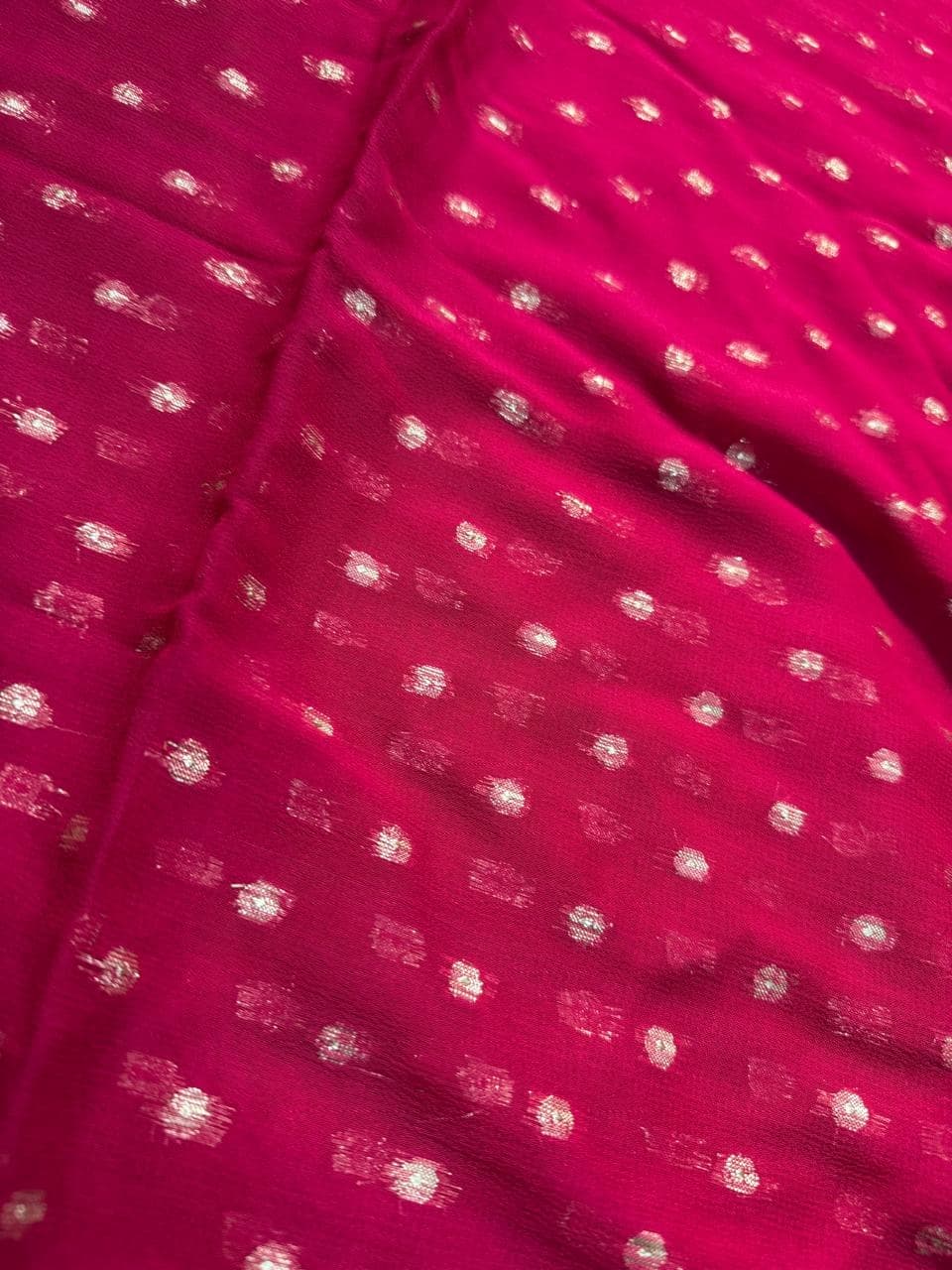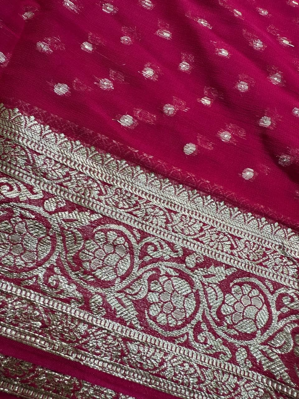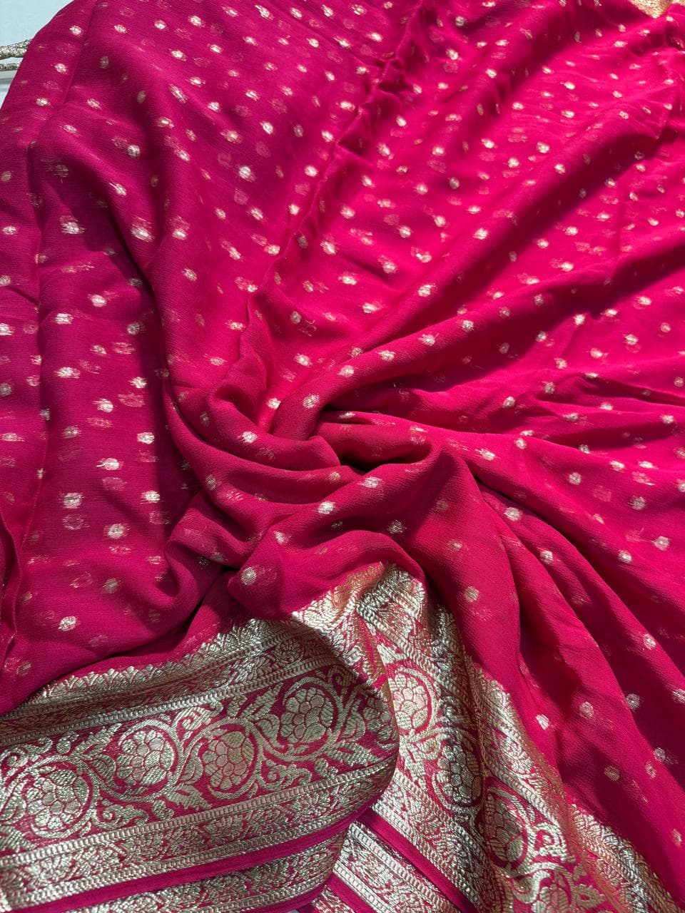 Fabric - pure georgette Color - Rani pink with butta Border - golden border Blouse - running blouse Pleates will flow like butter Free shipping SOLD OUT