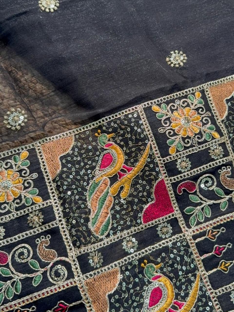 Fabric - pure georgette Color - black Border - Gold weaving border Blouse - multi color embroidery blouse piece Flowly pleates Free shipping 1 in stock Dispatch in 7-14 working days