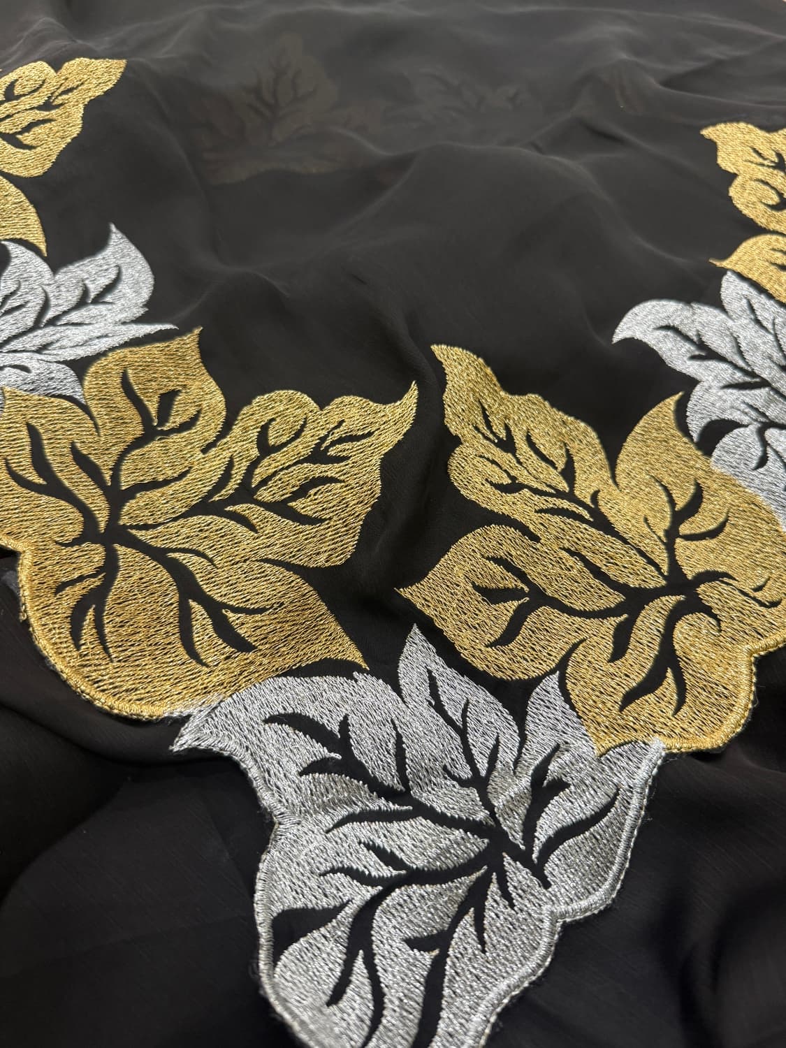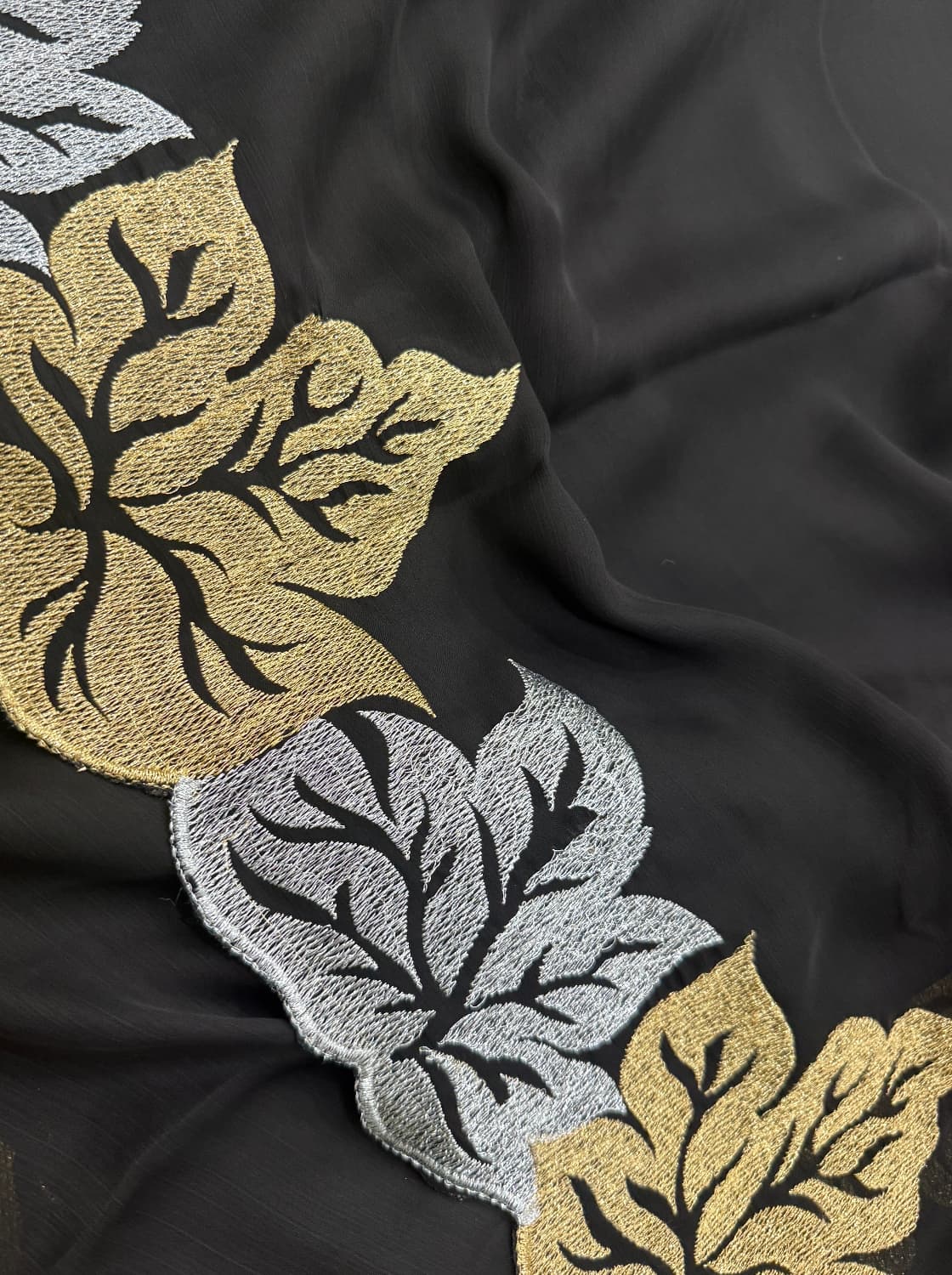 Fabric - Pure georgette Color - Jet Black Border - leafy cut work border Blouse - brocade Pleates will flow the way you tell 1 in stock Dispatch 7 -14 working days SOLD OUT
