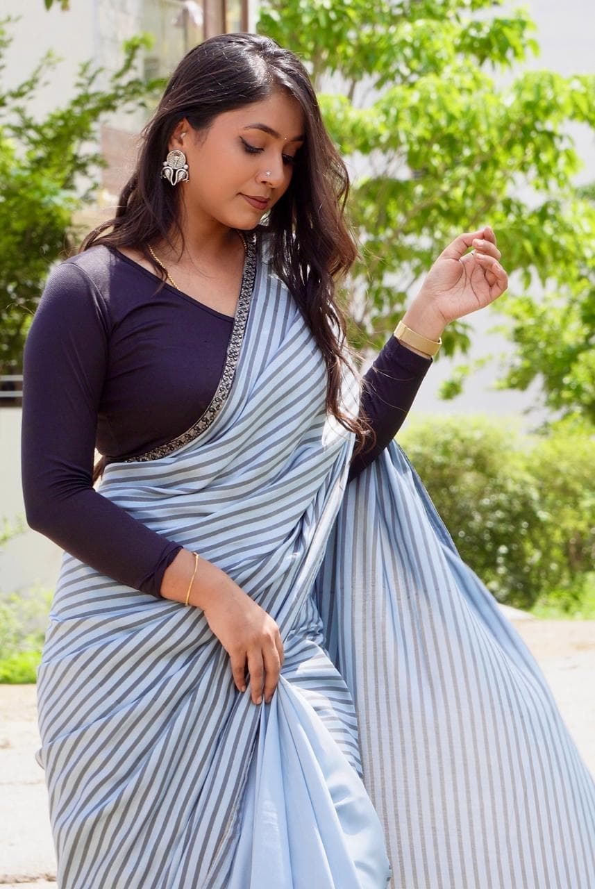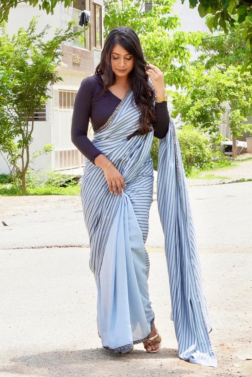Color : Grey with dark grey stripes Fabric : Lilly cotton (5.5mtrs) Blouse : black tie dye blouse (80-1mtr) Border : cotton embroidery border Saree style : Half and half Versatile , easy to style and super easy to drape 2 piece available