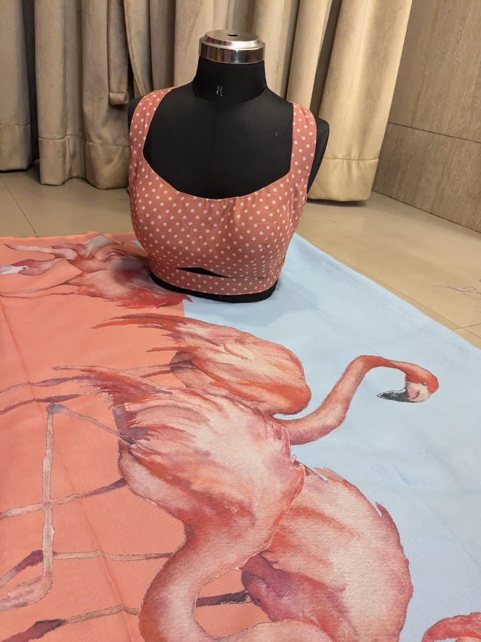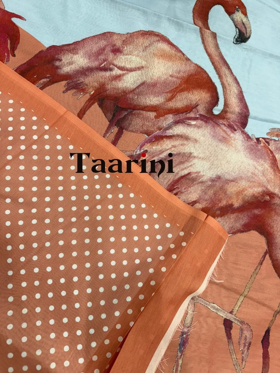 Fabric - mul cotton Color - Body sky blue Border - peach Blouse - peach with white dots Pallu - Flamingo print Light weight fabric free shipping Extremely soft on body