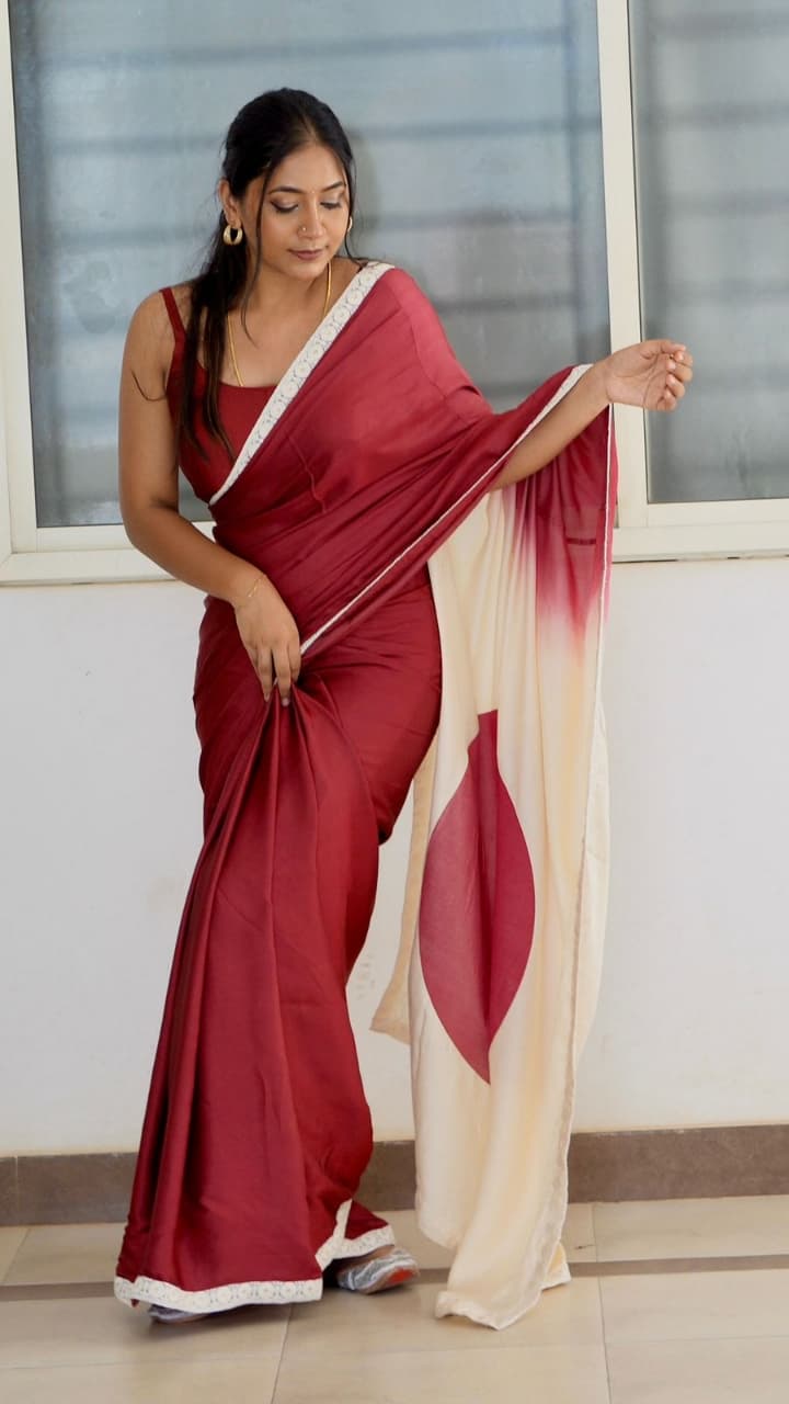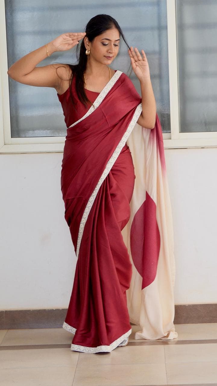 Color : Maroon with cream Fabric : modal satin (5.5mtrs) Blouse : 80cms to 1 mtr maroon blouse Border : cotton embroidery designer border Super soft saree, easy to drape 1 piece left