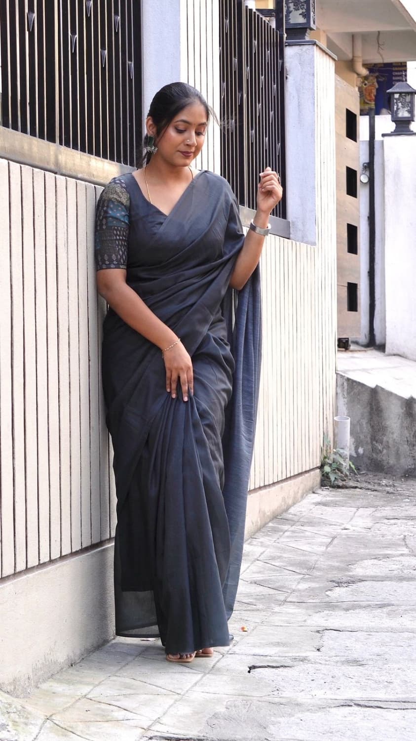 Color : Grey with dark grey stripes Fabric : Lilly cotton (5.5mtrs) Blouse : black tie dye blouse (80-1mtr) Border : cotton embroidery border Saree style : Half and half Versatile , easy to style and super easy to drape . 2 piece available