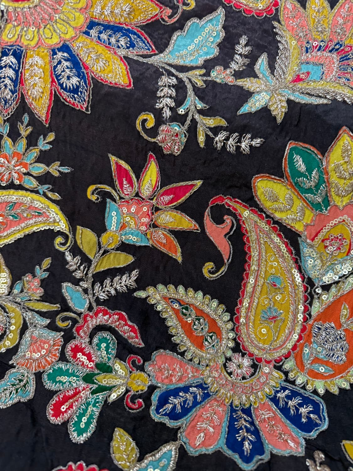 Fabric - Natural crepe (looks just silk) Comes with embroidery and sequin work . Extremely body friendly . 1 metre Free shipping 40 pannah , suitable for saree, lehenga ,blouse , indo western fits If required more than 1 mtr , whatsapp on 8951432832