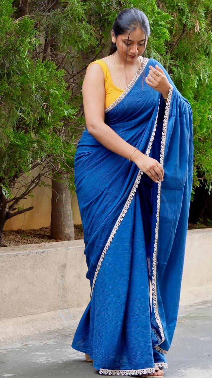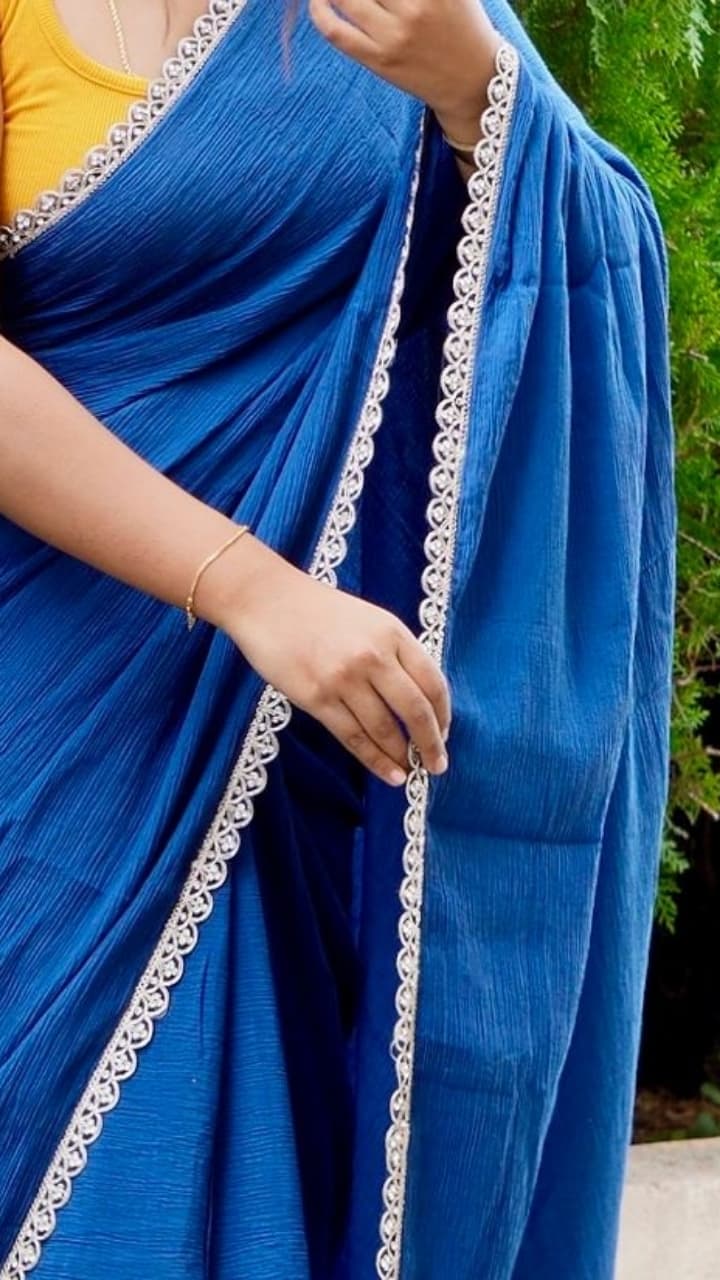 Color: Royal blue Fabric : Cotton crush (5.5mtrs) Blouse : 80cm to 1 mtr mustard Cotton crush Designer scallop lace 1/2 inch . 2 piece available